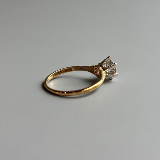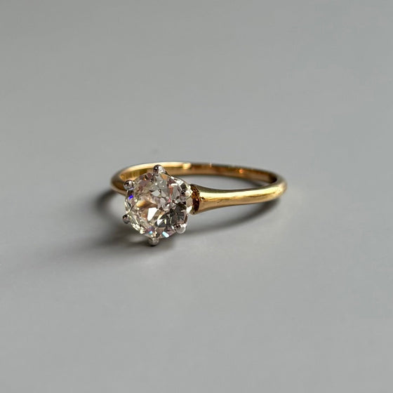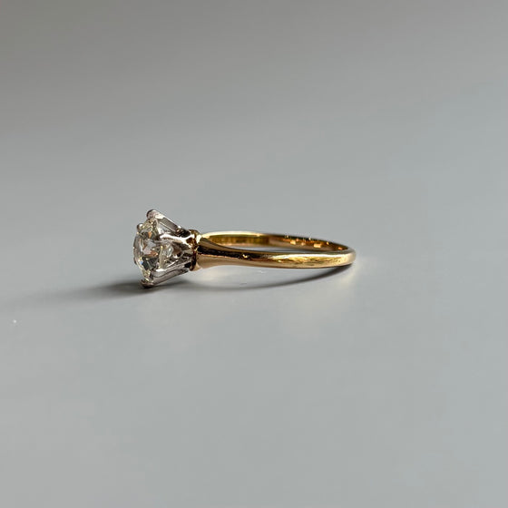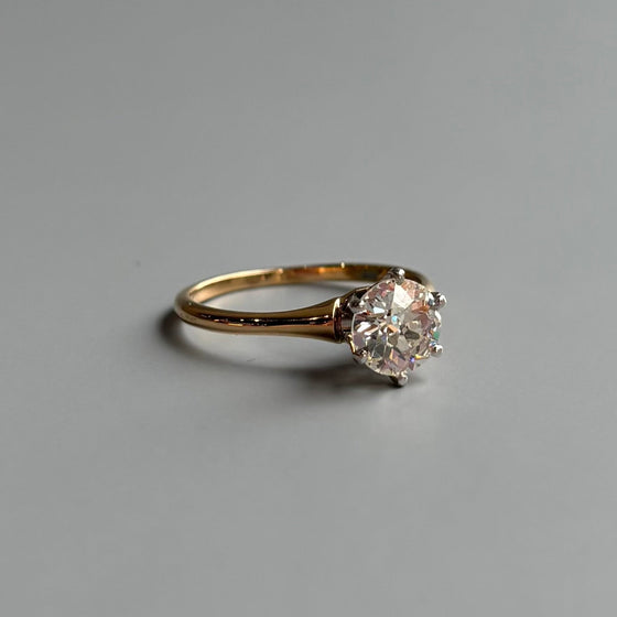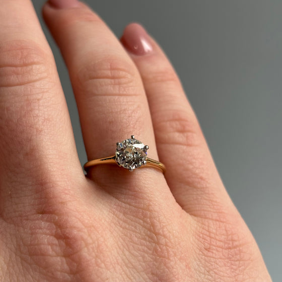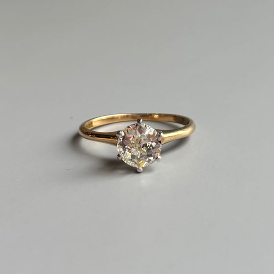 18k Two-tone antique solitaire circa 1934 from Buffalo, NY with one earth-mined 1.04 Old European cut diamond, GIA certified (5234205448) set into a white gold head with a warm yellow gold band. This ring has visible original engravings inside the band with the initials “M.E.R” in cursive. Along with the original makers mark reading “King and Eisele 13” located long ago on Franklin & Huron St. This piece comes with a written appraisal for insurance purposes (001-41810-001) Currently a size 6.25, can be adjusted.
