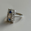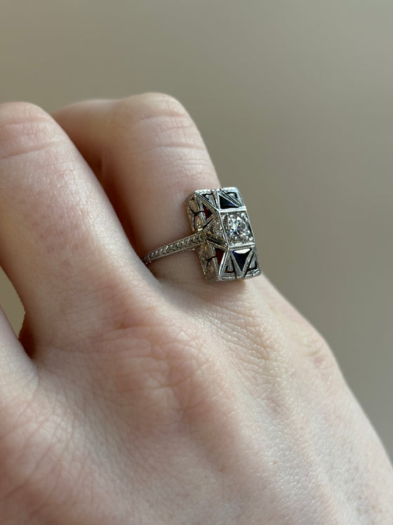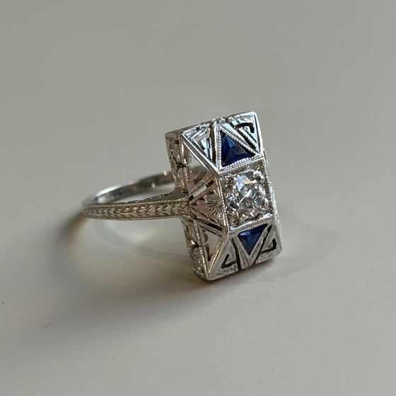 This 20k white gold Art Deco diamond & sapphire ring weighs 4.1 grams and showcases a beautiful, hand-sawn design. It features a 0.30 carat Old European cut diamond center, and two triangle-shaped blue sapphires, that total 0.80 carats. This ring includes an appraisal (#001-38791-001).