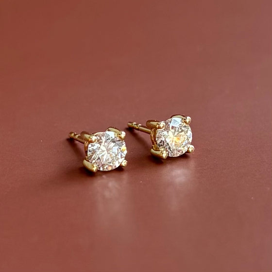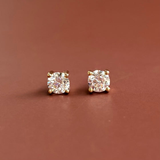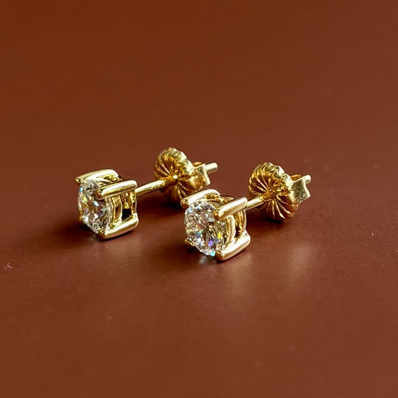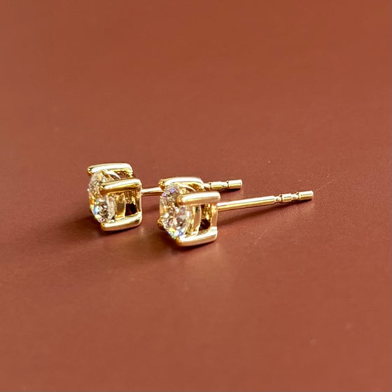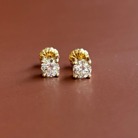 14k Yellow gold diamond stud earrings with two .37 carat round brilliant cut cut lab-created diamonds, .75 carats total diamond weight with double-notched friction posts.