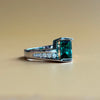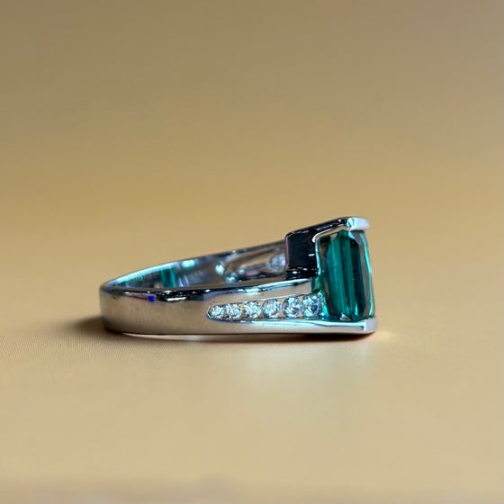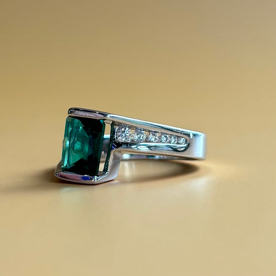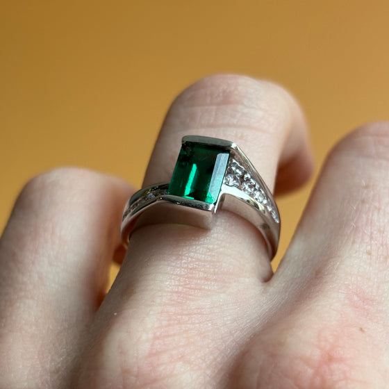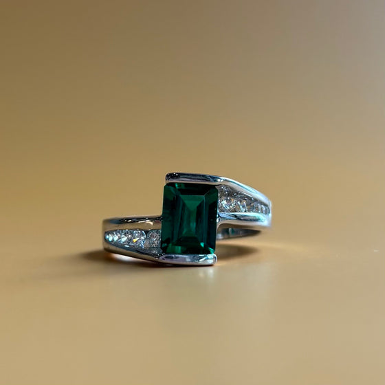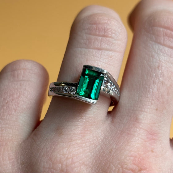 A sterling silver ring with one emerald cut Chatham bypass ring with CZ accents along the band. Rhodium dipped and currently a size 7, but could be adjusted.