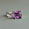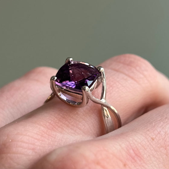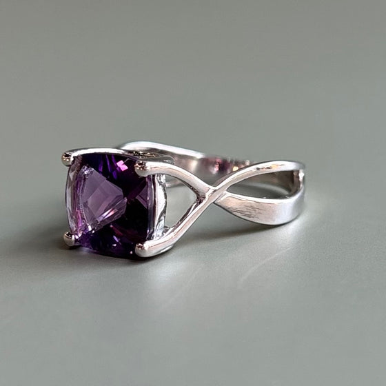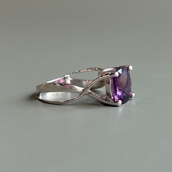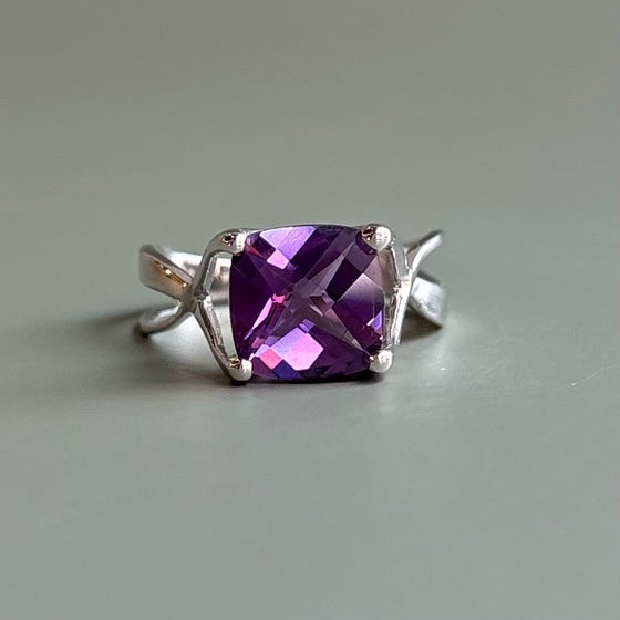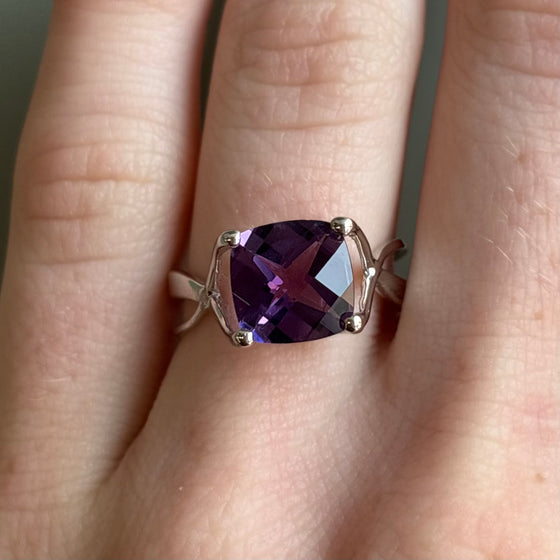 A sterling silver ring with one cushion shaped amethyst center with a checkerboard pattern. Rhodium dipped and currently a size 7, but could be adjusted.