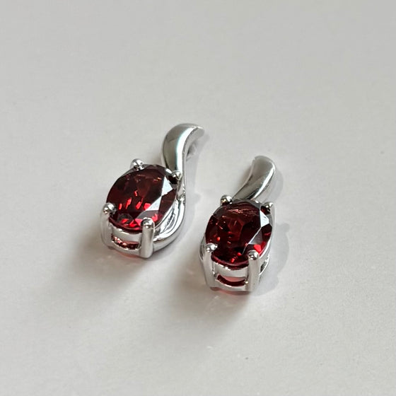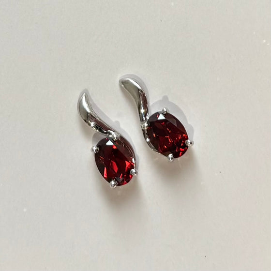 Sterling silver prong-set oval shaped garnet drop earrings. Rhodium dipped with a secure friction back setting.