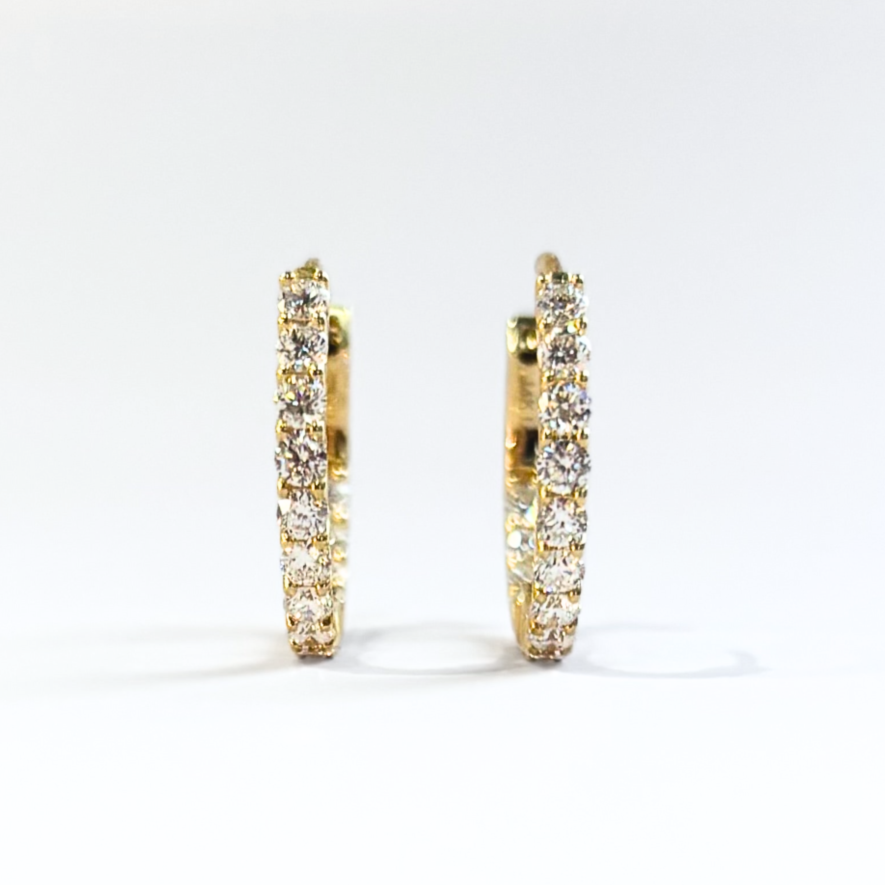 2.32 carats total weight of round brilliant lab-grown diamonds set along the inside and outside of 14K yellow gold hoops. E color, VS clarity, prong set. These catch light from every angle. Locking hinged closure with button release.