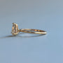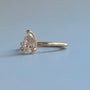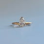 This pear solitaire is all about the profile view. While the top looks like a clean, classic solitaire, there is a hidden halo of diamonds tucked right under the center stone. It adds a bit of unexpected sparkle to a very architectural shape. The lab-grown center stone is a high-quality F color and VVS2 clarity, so it faces up bright and ice-cold against the warm gold band.