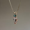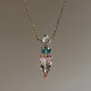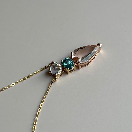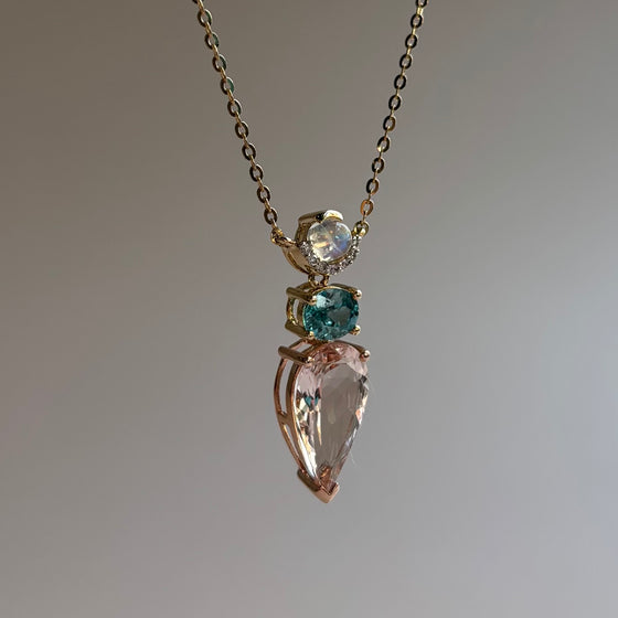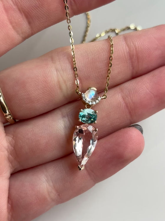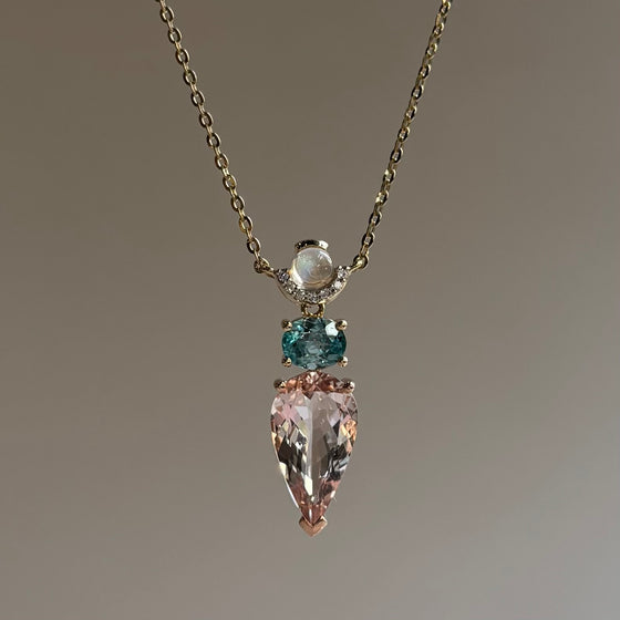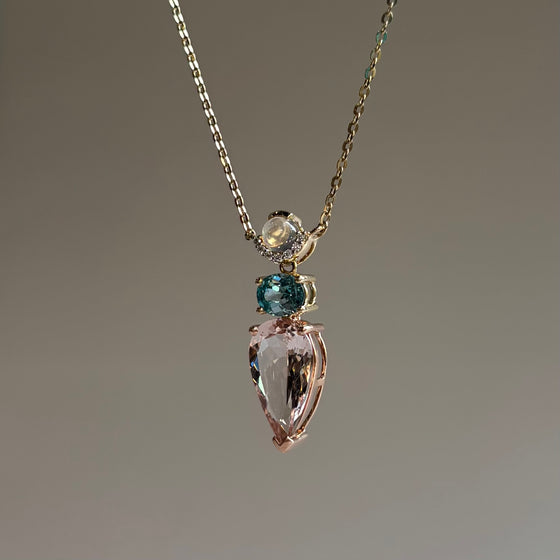 14k Yellow gold gemstone trio necklace with one 2.58 carat pear-shaped pink morganite gemstone set into a 14k rose gold basket, and one oval shaped Swiss blue topaz .80 carats, along with a cabochon moonstone accent above the two, weighing .36 carats with diamonds hidden just below all set in yellow gold. This piece is complete with an 18" chain with a 16" adjustment for varied height or stacking.