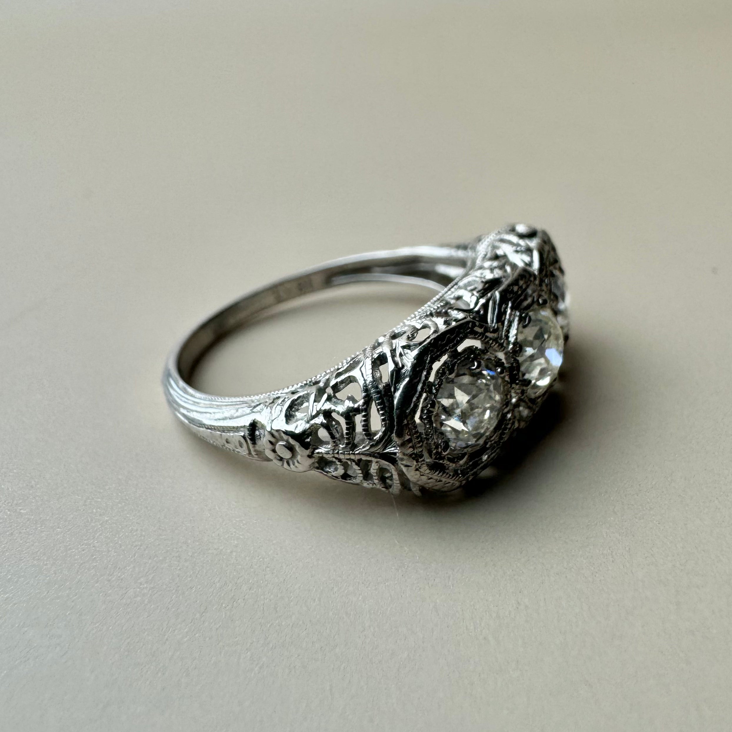 Art Deco 1.10ct Three Stone Old European Cut Diamond Filigree Ring | 18k White Gold | Vintage