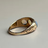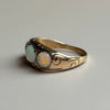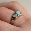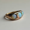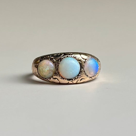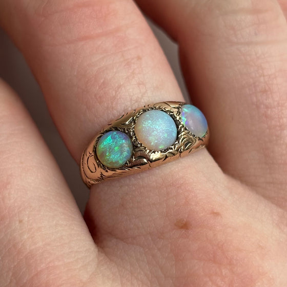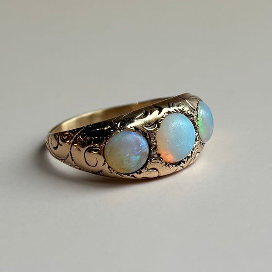 A 14k yellow gold Victorian opal ring. Three round opals with fire-y blue hues set into a band adorned with detail. This piece is currently a size 6.75, but can be adjusted to finger size.