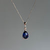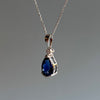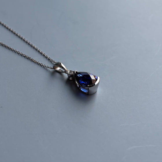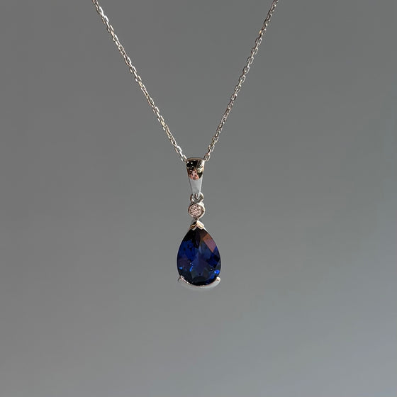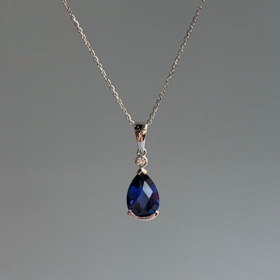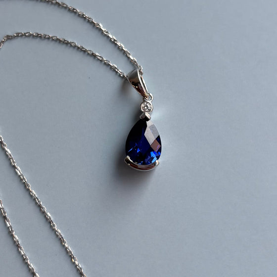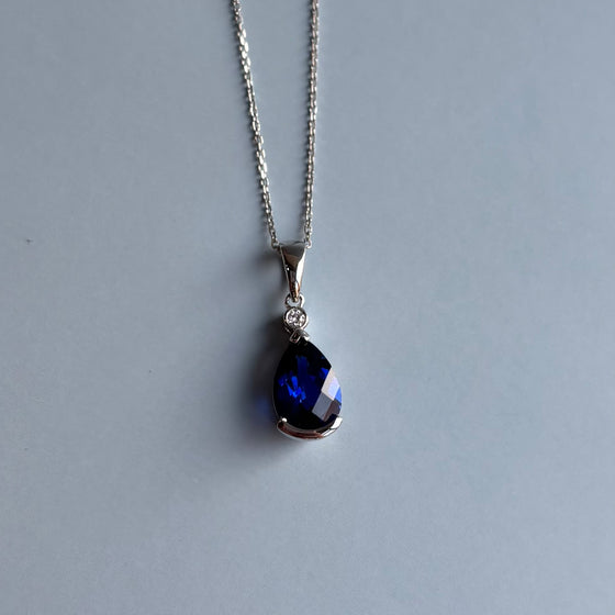 A sterling silver lab-created sapphire necklace with a pear-shaped gemstone and CZ accent above, complete with an 18" cable chain and rhodium finish.