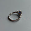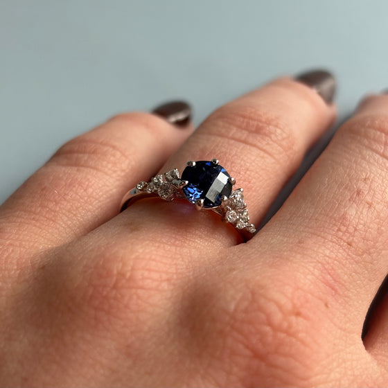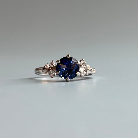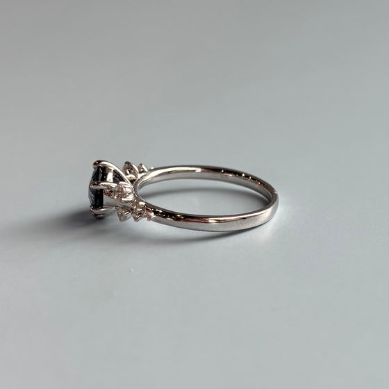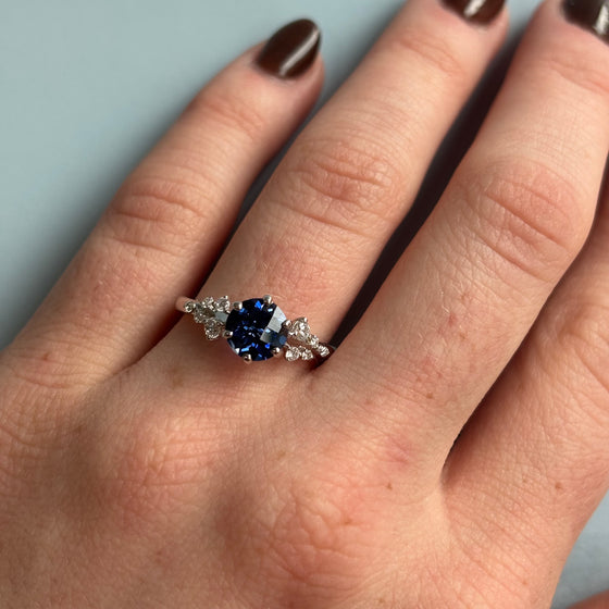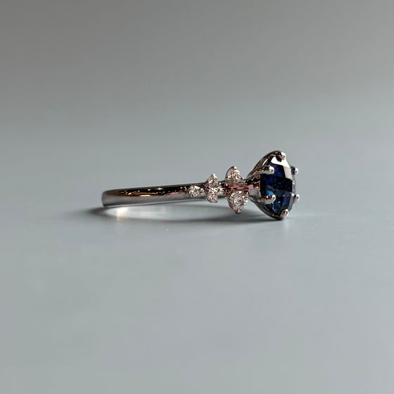 A sterling silver sapphire ring with one round gemstone prong-set and different sized CZ accents trailing along the band. Currently a size 7 and could be adjusted. Complete with rhodium finish.