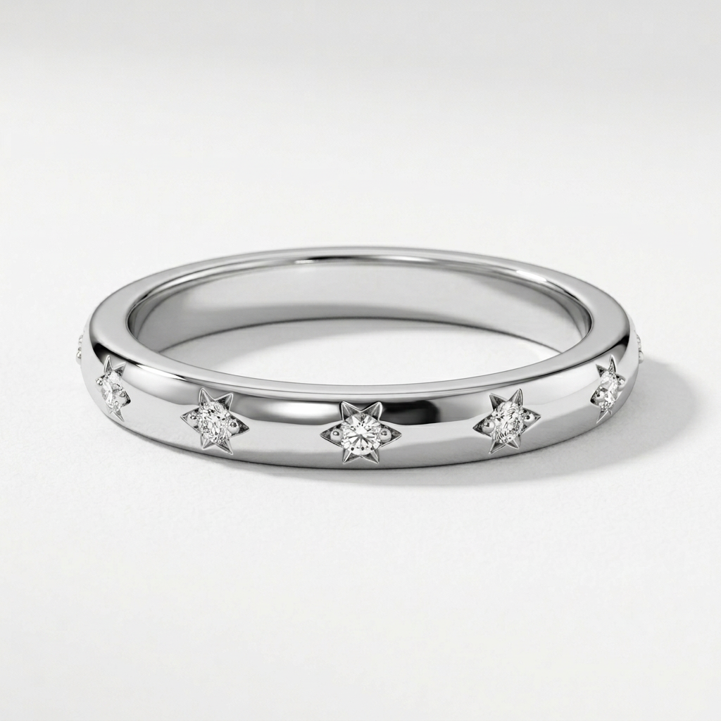 The Celestial Eternity Band gives a classic diamond band a more distinctive finish. Twelve round brilliant lab grown diamonds are set into a slim 2 mm 14K yellow or white gold band, each framed with subtle starburst detail that catches the eye up close. It works beautifully as a wedding band, anniversary band, stacking ring, or right hand ring when you want something polished with a bit more personality.