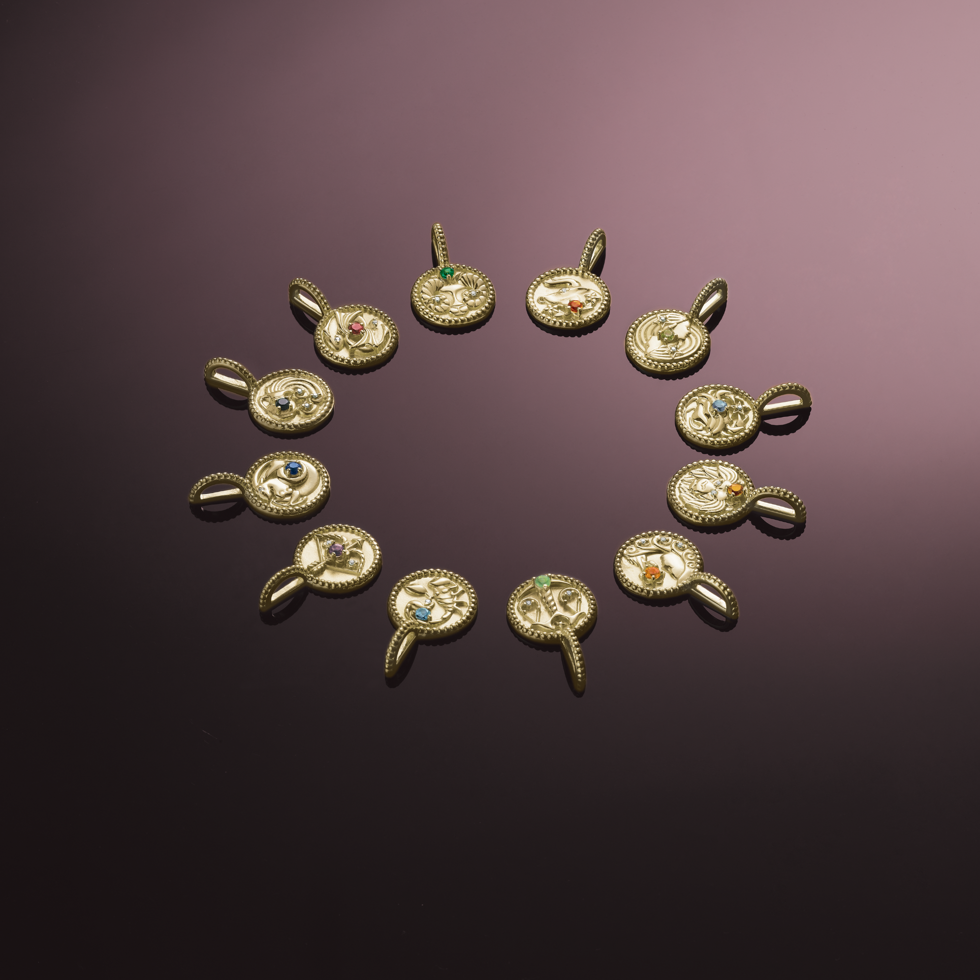 Zodiac gemstones connect to your sign's energy rather than your birth month. The design draws from classical coin medallions and astronomical charts, cast in 14K yellow gold with natural gemstones and diamonds. Pair it with a chain you already own or browse our gold chains to complete the look.